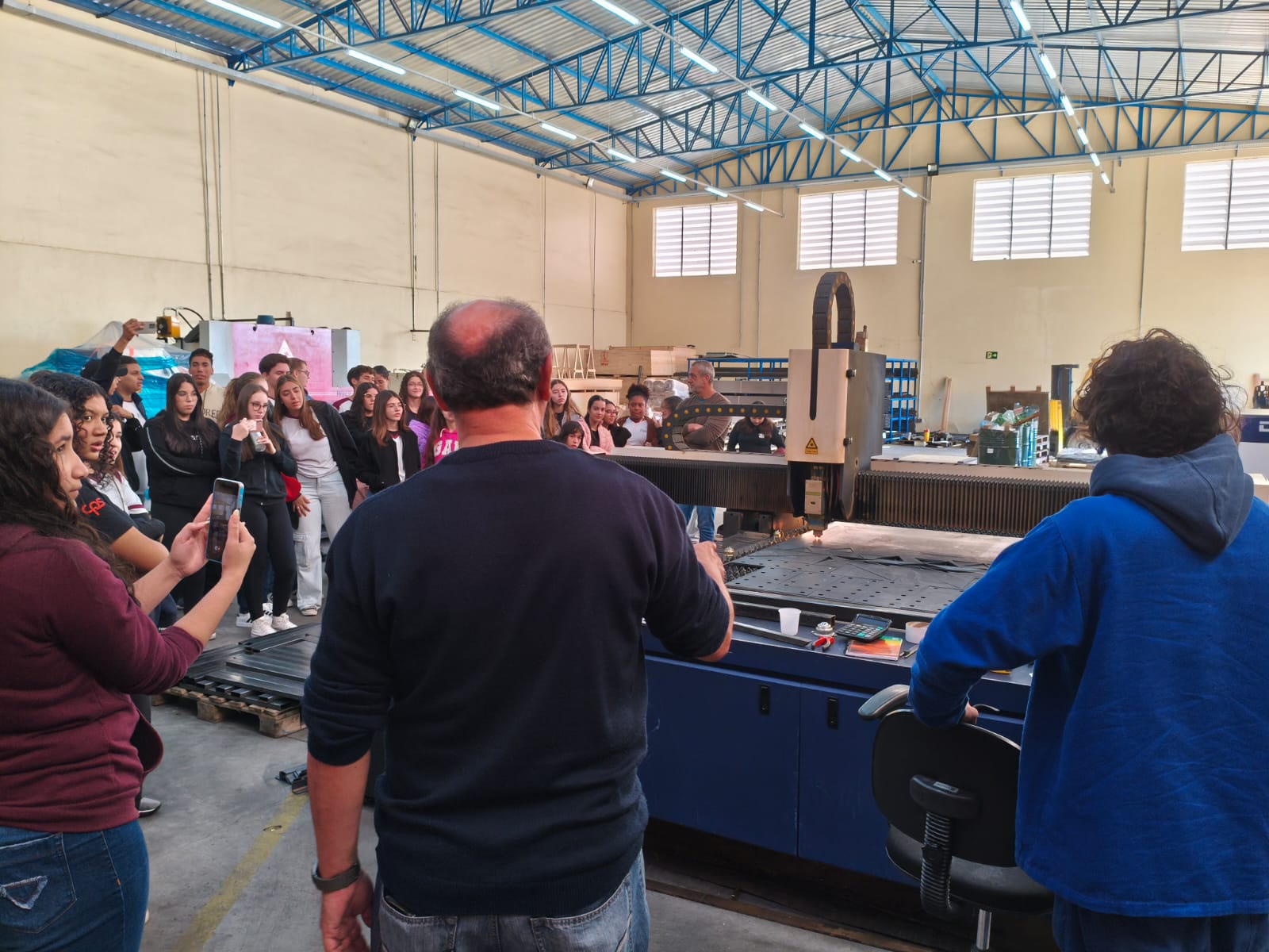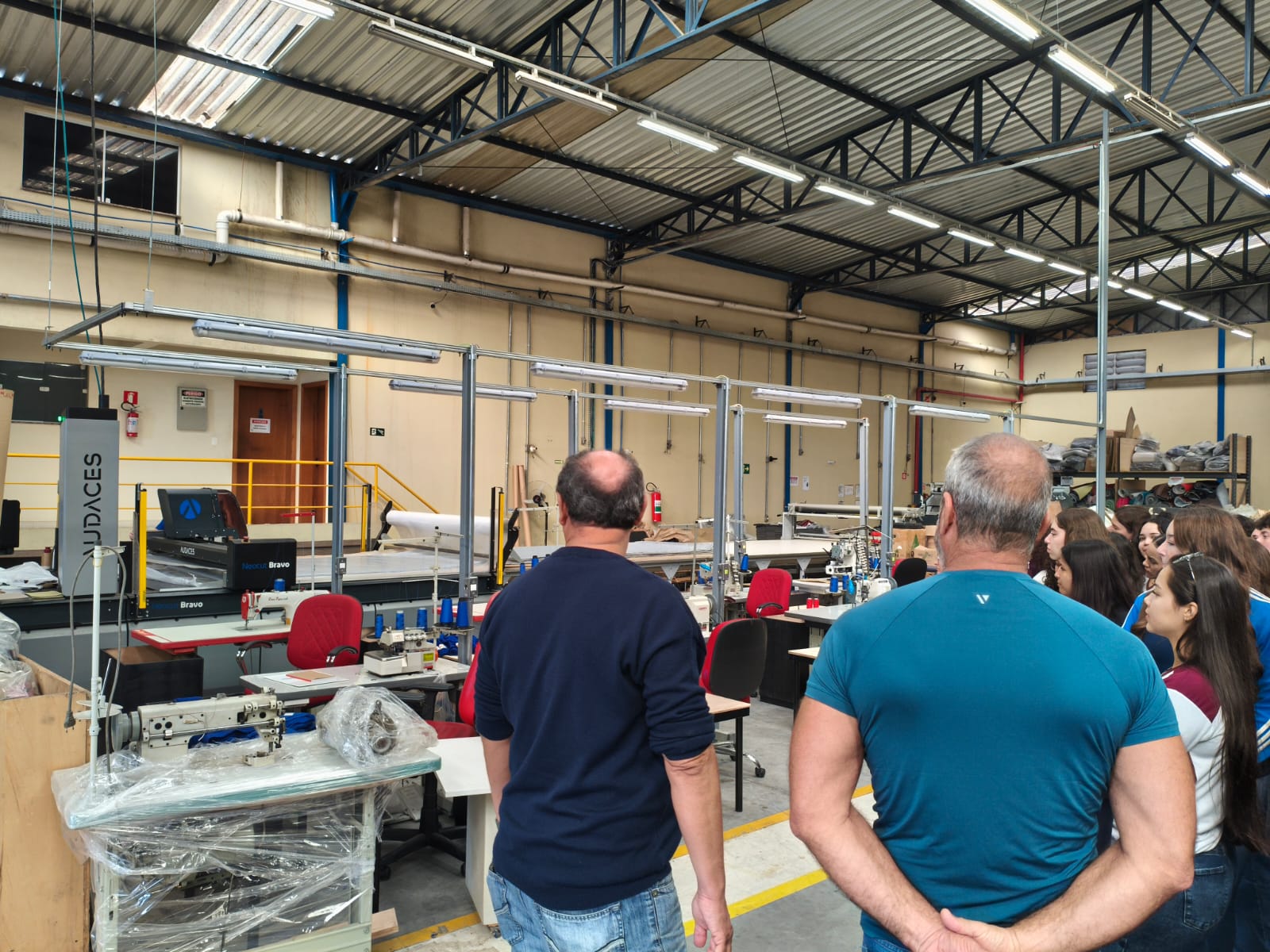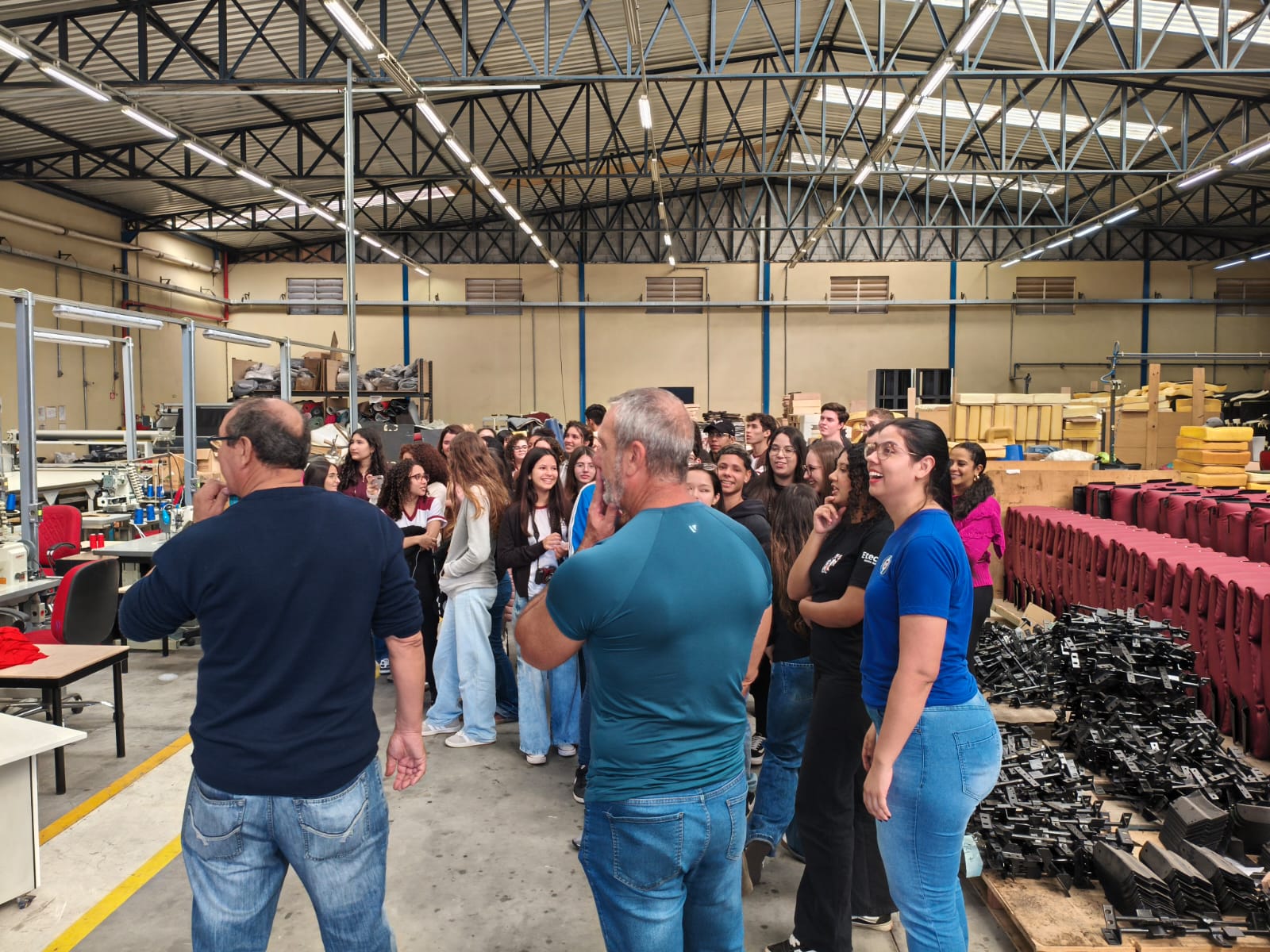 A recepção foi conduzida pelo Engenheiro de Produção Sr. Sebastião, que apresentou um panorama institucional da empresa, abordando sua história, valores e posição estratégica no mercado. Em seguida, os alunos foram conduzidos por todas as etapas da linha de produção, começando pela área de corte e preparação de matéria-prima. O grupo observou o uso de tecnologias avançadas para o corte preciso de madeiras, tecidos e espumas, destacando o foco da empresa na eficiência operacional e na redução de desperdícios.