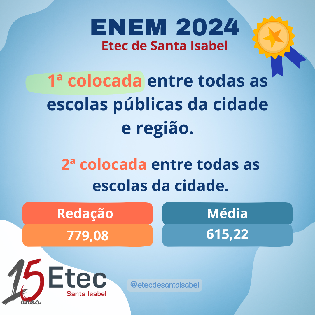 A Etec de Santa Isabel conquistou um importante destaque na edição de 2024 do Exame Nacional do Ensino Médio (ENEM), figurando entre as escolas com melhor desempenho na cidade de Santa Isabel e também na região. O resultado evidencia o comprometimento da unidade com a qualidade do ensino público e a formação integral dos estudantes.