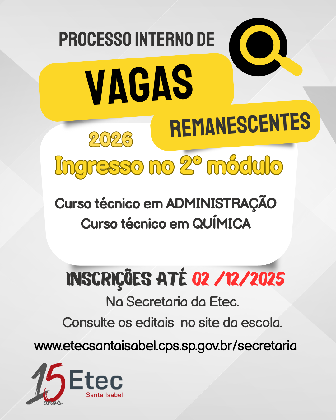 O Superintendente da Etec de Santa Isabel informa que está aberto o processo de vagas remanescentes – cadastro reserva – para ingresso na 2ª série dos cursos de Ensino Médio com Habilitação Profissional de Técnico em Administração (período integral), Ensino Médio com Habilitação Profissional de Técnico em Informática para Internet (período integral), Ensino Médio com Habilitação Profissional de Técnico em Recursos Humanos (período noturno) e ingresso no 2º módulo dos cursos técnicos em Administração e Química, no período noturno.